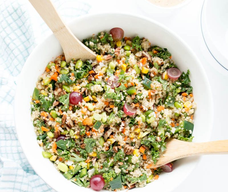 California Chopped Kale Salad. Vegan, Gluten Free. Quinoa, kale and all the veggies, plus flaked coconut & juicy grapes with a champagne vinaigrette.